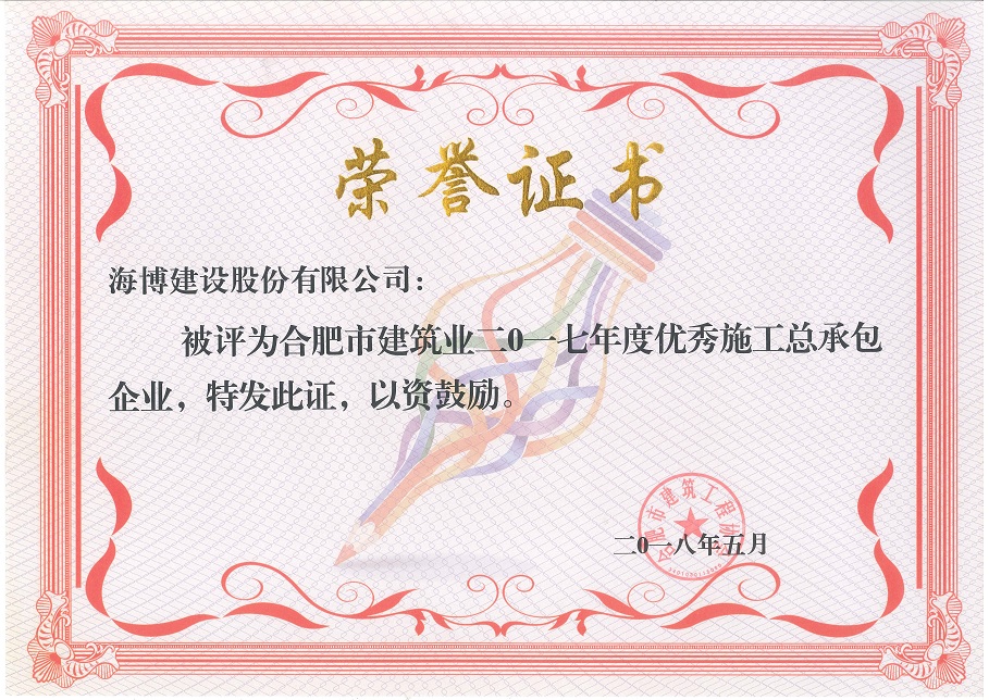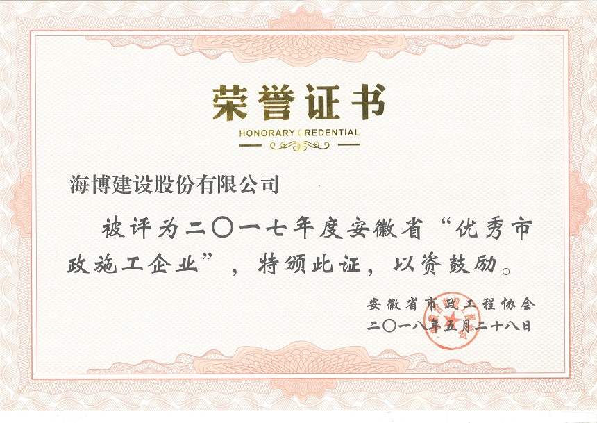 近日,安徽省市政工程協會發布了市政協會秘字【2018】06號文件,文件中表彰了2017年度“安徽省優秀市政施工企業”和“安徽省市政施工企業優秀建造師(項目經理)”。經過省市政工程協會專家評審委員會的層層評比...