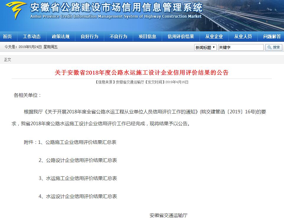近日,安徽省交通運(yùn)輸廳公告了“安徽省2018年度公路水運(yùn)施工設(shè)計(jì)企業(yè)信用評(píng)價(jià)結(jié)果”,我公司被評(píng)為省級(jí)公路施工行業(yè)最高等級(jí)“AA”級(jí)信用企業(yè)。 本次“AA”級(jí)信用企業(yè)的獲評(píng),是對(duì)我司...