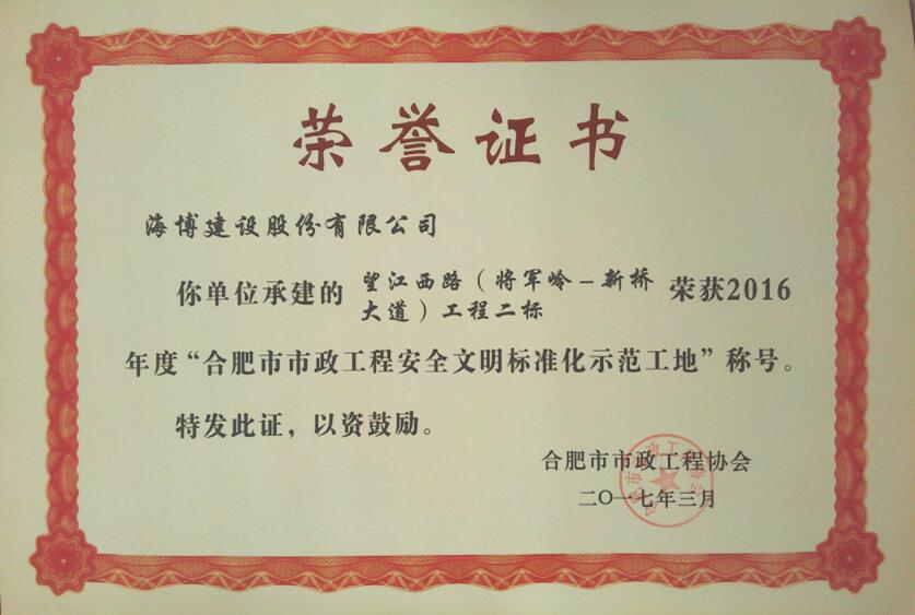 望江西路(將軍嶺路-新橋大道)建設(shè)工程二標(biāo)是空港產(chǎn)業(yè)新城與主城區(qū)重要通道,該工程積極開展安全生產(chǎn)文明施工標(biāo)準(zhǔn)化管理成效顯著,近日榮獲合肥市2016年度“市政工程安全文明標(biāo)準(zhǔn)化示范工地”。同時(shí),該工程受到合肥市公路管理局的高度評價(jià),已經(jīng)通過“平安工地”的評審。